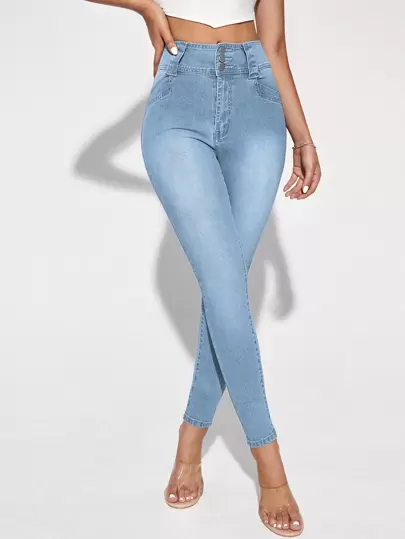 SHEIN Essnce High Waisted Skinny Jeans - Light Wash - View 1