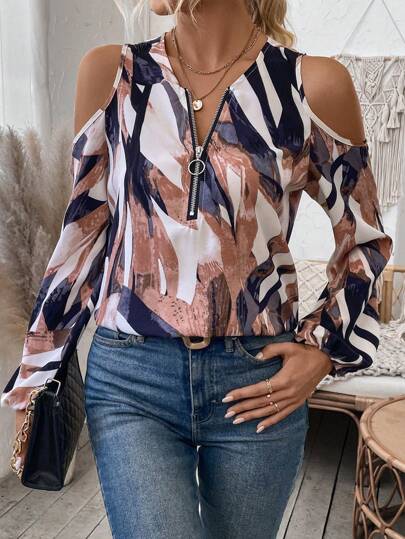 SHEIN LUNE Hollow Out Shoulder Zipper Half-open Collar Top - Multicolor - View 1
