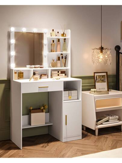 Hzuaneri Dressing Table With Mirror And 10 LED Lights, Makeup Vanity With 3 Shelves & 4 Open Compartments, Large Drawer & Cabinet, Adjustable Lighting Brightness, No Stool - White - View 1