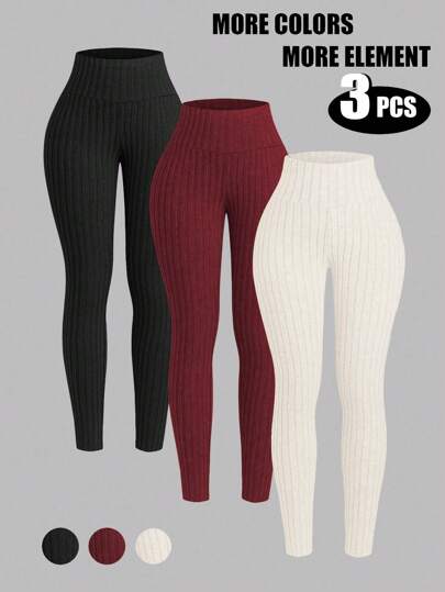 INAWLY 3pcs/Set Women's Solid Ribbed Tight Leggings Fall Cloth For Women - Multicolor - View 1