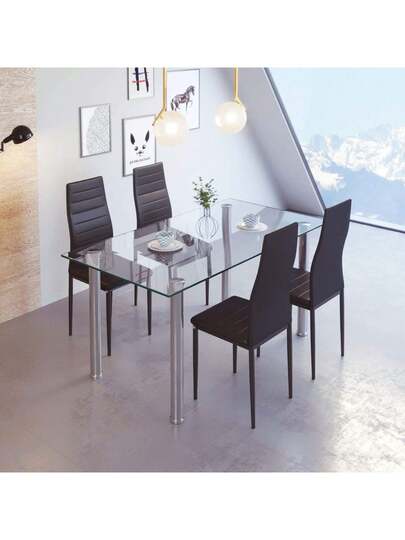 High-End Kitchen Table: 8mm thick Clear tempered rectangular glass tabletop with sturdy metal frame. And the smooth surface is easy to clean. Excellent Workmanship Dining Chairs: Set of 4 high-back white dining chairs are matched with the table. The white smooth faux leather wraps the sponge, and daily cleaning only requires wiping with a damp cloth. Metal frame, stable, strong and durable. Application: Suitable for dining room, kitchen. Don't worry about not having a big space to enjoy dinner, it is very space-saving and the four chairs can be placed completely under the dining table. Perfect for a family with 4-6 people. Dimension: Table: 47 * 27 * 29 inch. Chairs: Seat:15.16 * 15.75 inch, seat height: 17.12 inch, Back height: 21.46inch. Need to assemble, if you have any questions, please feel free to contact us. Match your Home: The Clear dining table and Chairs goes well with all styles of decoration, and you can use it in your beloved home with confidence. If you have any questions, please feel free to contact us.