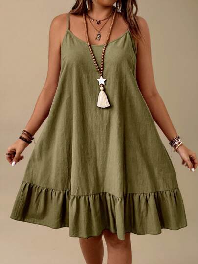 Linhara Pure Plus Size Vacation Casual Solid Color Ruffle Hem Spaghetti Strap Dress - Army Green - View 1