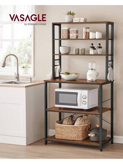 Kitchen Storage Rack, Coffee Bar, Baker's Rack, Total 6 Shelves And 6 Hooks, For Microwave, Steel Frame, Industrial, 40 X 80 X 167 Cm, Rustic Brown And Black/Oak Colour And White - Brown - View 1