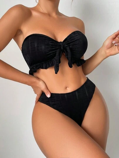 Knot Front Bandeau Bikini Set - Black - View 1