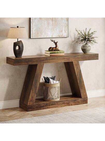 LITTLE TREE 140cm Long Console Table, Solid Wood Farmhouse Sofa Table For Behind Couch, Entryway Hallway Table With Storage, Rustic Narrow Entry Table For Living Room, Easy Assembly​ - Brown - View 1