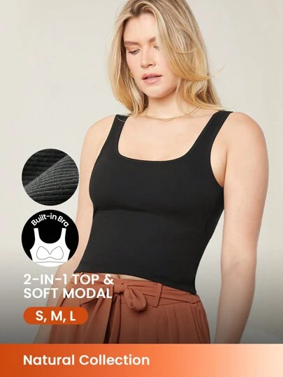 LUVLETTE Black Modal Ribbed Longline Wireless Built-In Bra Workout Sports Tank Top With Bra Lingerie As Outerwear - Black - View 1