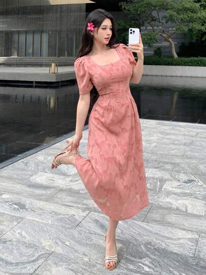 DAZY Lace Allover Floral Pattern Square Neck Mid-Long Dress For Women,Milkmaid Dress - Hot Pink - View 1