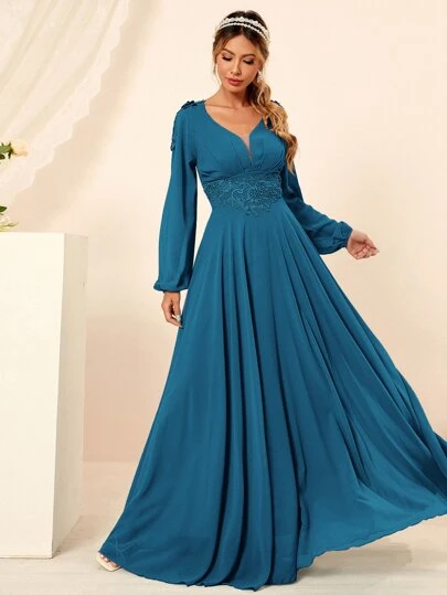 Modelyn Lace Trimed Appliques Maxi A-line Dress - Teal Blue - View 1