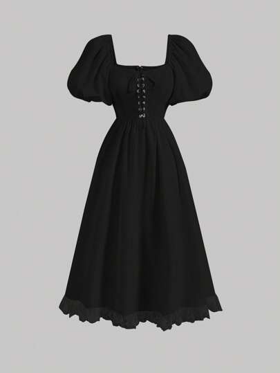 SHEIN MOD Lace Up Front Puff Sleeve Dress - Black - View 1