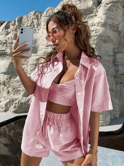 SHEIN Unity Ladies Fashionable Pink Striped Shirt Three-Piece Set - Red - View 1