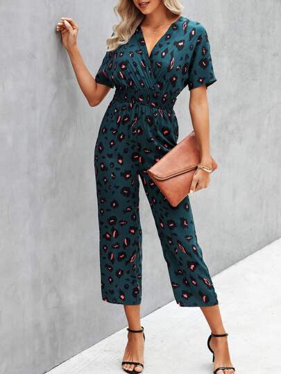 Leopard Print Wrap Shirred Waist Jumpsuit - Dark Green - View 1