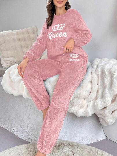 Letter Embroidery Drop Shoulder Flannel Top & Pants Lounge Set Cozy Outfit, Fall Winter Clothes, Fluffy - Pink - View 1