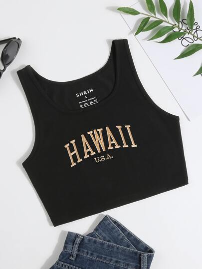 Letter Graphic Crop Tank Top - Black - View 4