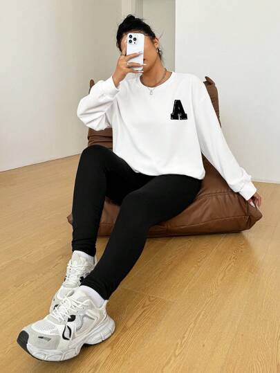 SHEIN EZwear Letter Printed Monochrome Set, Plus Size 2 Pieces Outfit - Black and White - View 1