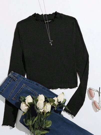 Muchica Lettuce Edge Waffle Knit Tee - Black - View 6