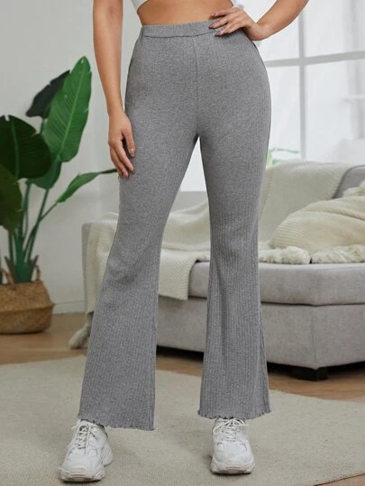 SHEIN EZwear Lettuce Hem Flare Leg Trousers - Light Grey - View 1