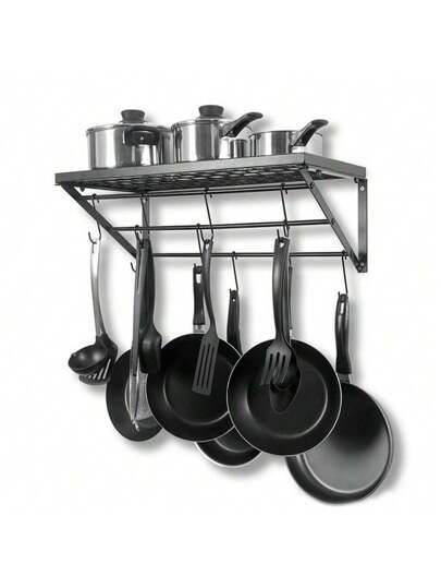 LIVINGANDHOME Living And Home Kitchen Storage Shelf,Hanging Pot Holder Rack,Wall Pot Pan Frame Hanger With Removable Hooks,Kitchen Wall Mounted Storage Shelf Rack Organizer For Pan Sets, Cutlery, Kitchenware,Kitchen Utensils - Black - View 1