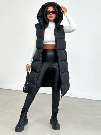 EURMUSE Long Puffer Vest With Puffer Hood, Double Cursor Zipper And Pockets - Black - View 1