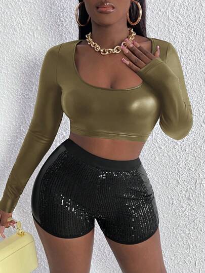 Slaydiva Long Sleeve Pu Leather Cropped Top - Army Green - View 1