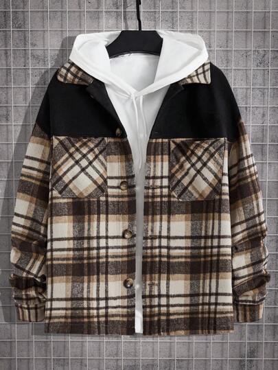 Manfinity VCAY Loose Fit Men's Plaid Print Drop Shoulder Pocket Patchwork Overcoat Without Hoodie, For Fall Winter - Multicolor - View 1