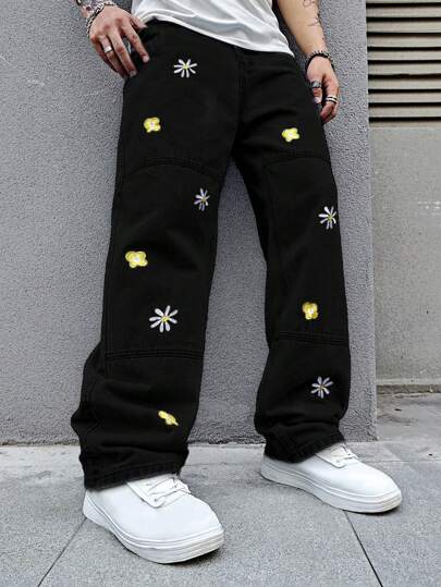 Manfinity EMRG Loose Fit Men's Straight Leg Jeans With Floral Embroidery - Black - View 1