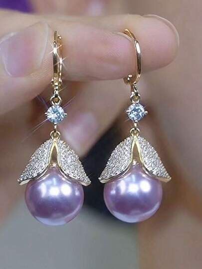 Luxury Rhinestone-Encrusted Purple Pearl & Leaf Design Unique Statement Earrings, Fashion & Versatile - Purple - View 1