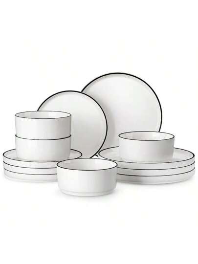 MALACASA 12 Pieces Ceramic Dinnerware Set, White With Black Border, Round Plate, Porcelain Dinnerware, Dinner Plates, Dessert Plates And Bowls For 4 Person - White With Black Border - View 1