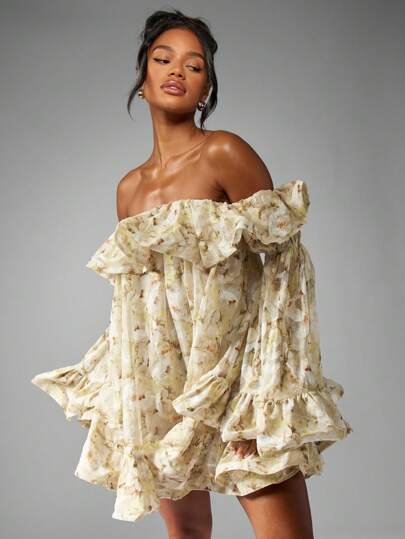 MISSGUIDED Chiffon Off Shoulder Mini Dress Floral Print Ruffle Bell Sleeve Spring Summer Wedding Guest Boho Garden Party Smock - Yellow - View 1