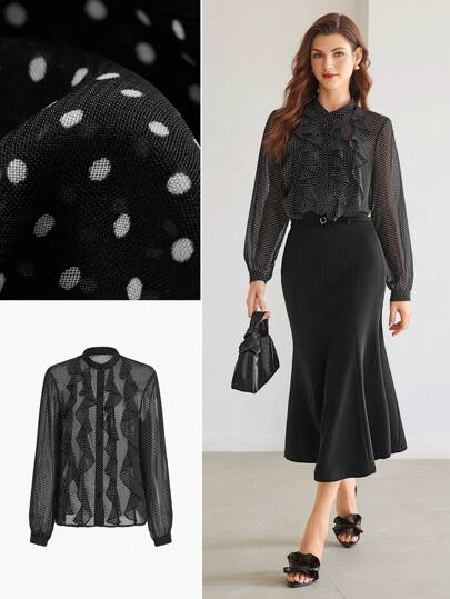 MOTF PREMIUM CHIFFON WOMEN'S POLKA DOT RUFFLE TRIM SHIRT - Black and White - View 1