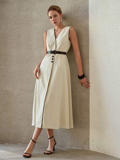 MOTF PREMIUM WOMEN'S LINEN-LIKE CONTRAST BINDING SLEEVELESS BUCKLE BELTED DRESS - Apricot - View 1