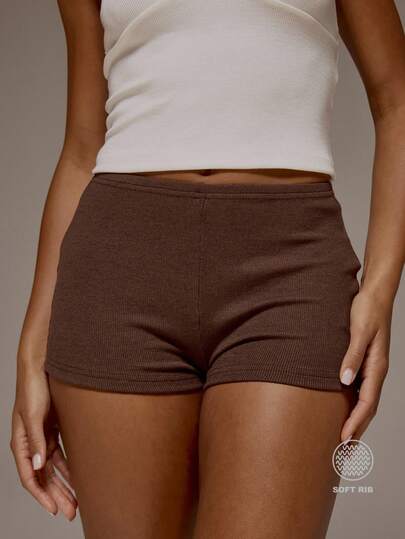 MUSERA ESSENTIALS Ribbed Elasticated Waist Fitted Micro Mini Shorts Spring Summer Holiday Everyday Cute Daily Basics Essential - Coffee Brown - View 1