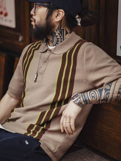 Maden Vintage Knitted Polo Shirt, Preppy Style Color Block Stripe Collar Short Sleeve In College - Khaki - View 1