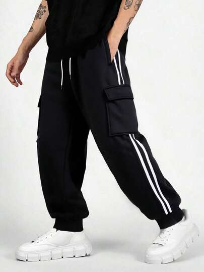 Manfinity Hypemode Men's Casual Fashion Street Drawstring Waist Flap Pocket Contrast Striped Side Elastic Cuff Cargo Pants - Black - View 1