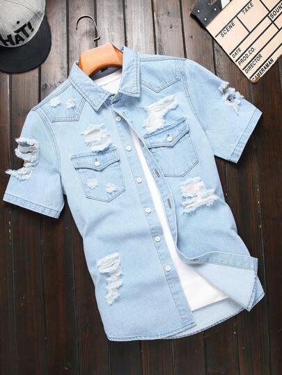 Manfinity Homme Men's Casual Washed Distressed Denim Short Sleeve Shirt Men Jean Shirt - Light Wash - View 1