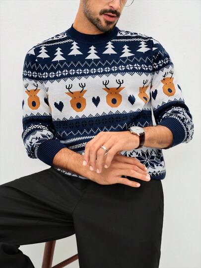 Manfinity Homme Men's Colorblock Reindeer Pattern Crew Neck Long Sleeve Sweater Jumpers Men Knit Wear Men Christmas - Royal Blue - View 1