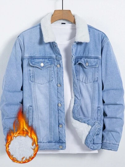 Manfinity Homme Men's Thermal Lined Denim Jacket With Fur Collar - Medium Wash - View 1