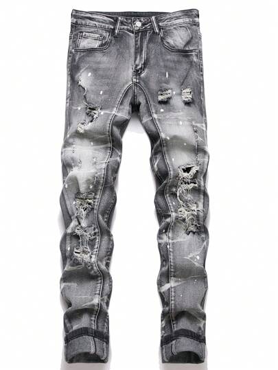Manfinity LEGND Men's Casual Street Ripped Jeans, Men Distressed Jeans, Ripped Jeans Men, Men Paint Splatter Jeans - Light Grey - View 1