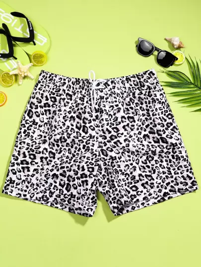 Surfspeed Men Leopard Graphic Print Drawstring Waist Swim Trunks Pool Shorts, For Beach, Vacation,Hawaiian - Multicolor - View 1