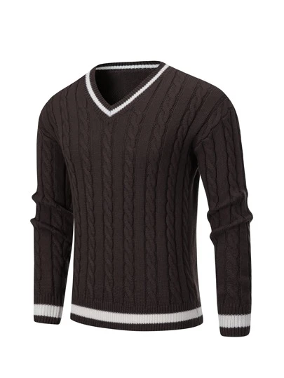 Manfinity Men Striped Trim Cable Knit Cricket Jumper - Chocolate Brown - View 1