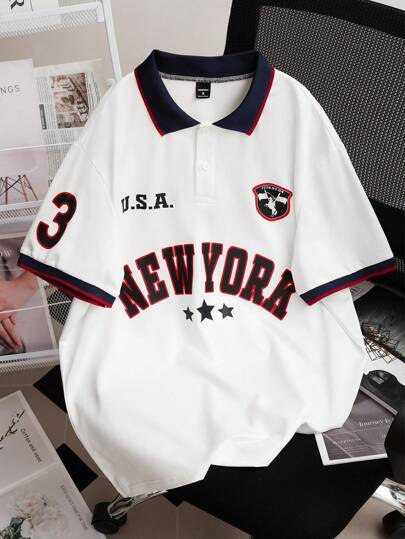 Manfinity Campus Court Men's Casual Letter Print Short Sleeve Polo Shirt For Commuting, Summer - White - View 1