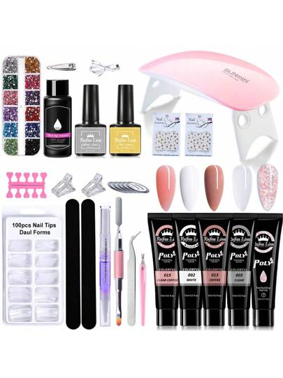 Manicure Set Poly Nail UV Gel Kit LED Lamp False Nail Extension Builder Polygels Set Base Top Coat Acrylic Solution KIt - Pink - View 1
