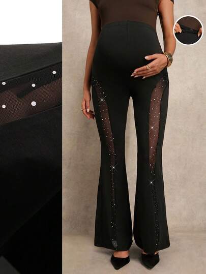 MaterniChic Maternity Clothes Maternity Pants Summer Pregnant Clothes Black Maternity Pants Maternity High Waist Mesh Patchwork Slim Fit Flare Pants  Party - Black - View 1