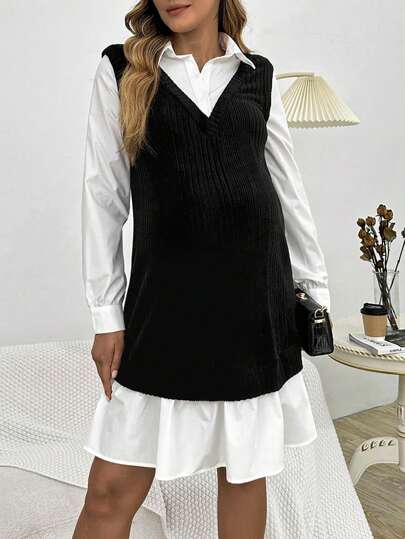 SHEIN Maternity 2 In 1 Ruffle Hem Dress - Black - View 1
