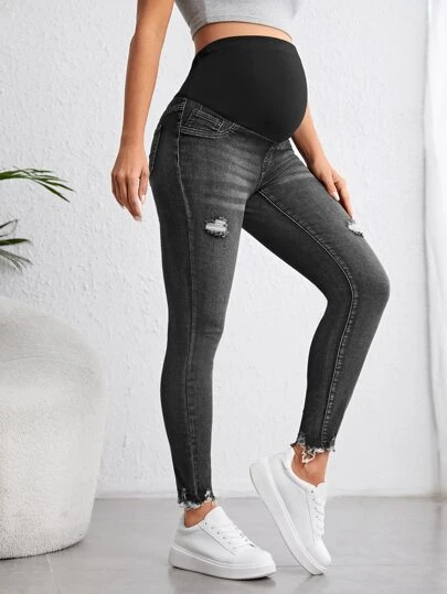 SHEIN Maternity Wide Waistband Ripped Raw Cut Skinny Jeans - Grey - View 1