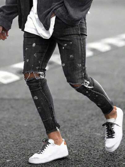 Men's Casual Water-Washed Ripped Skinny Jeans - Black - View 1