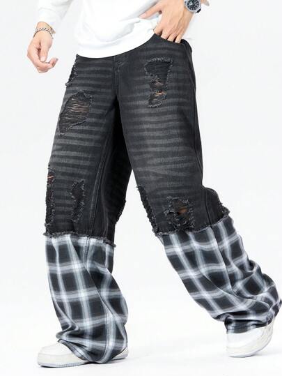 Manfinity Roghcode Men's Fashion Plaid Patchwork Distressed Denim Jeans - Black - View 1