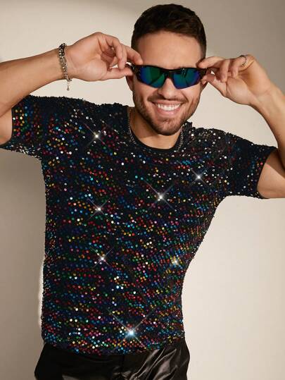 FeverCity Men's Glitter Short Sleeve T-Shirt With Round Neck - Multicolor - View 1