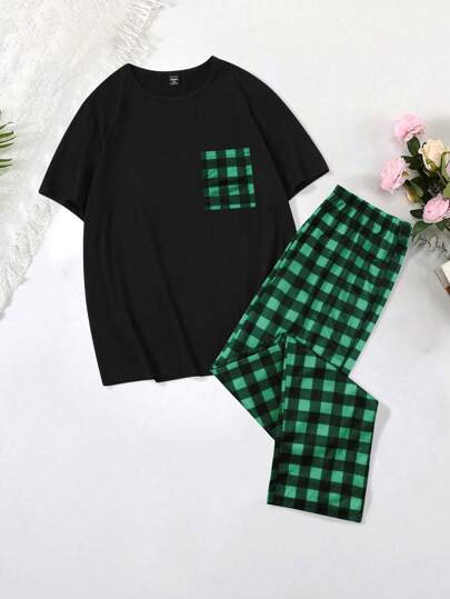 Men's Plaid Pocket Short Sleeve Pajama Set - Black - View 1