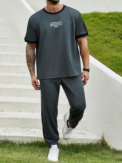 Manfinity Homme Men's Plus Size Slogan Print Short Sleeve T-Shirt And Long Pants 2pcs/Set - Dark Grey - View 1
