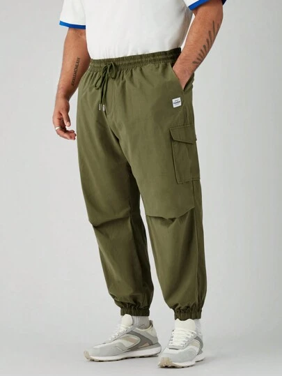 Manfinity VCAY Men's Solid Woven Mid-Rise Plus Size Integrated Casual Straight Tapered Joggers, Suitable For Everyday Wear In Spring And Summer - Army Green - View 1